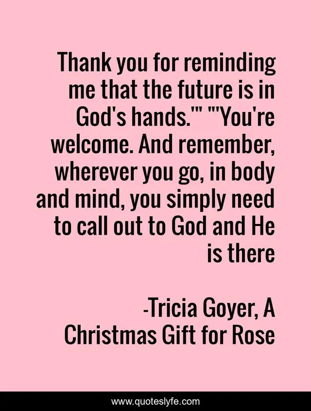 This page presents the quote "Thank you for reminding me that the future is in God's hands.'" "'You're welcome. And remember, wherever you go, in body and mind, you simply need to call out to God and He is there". Author of this quote is Tricia Goyer, A Christmas Gift for Rose. This quote is about faith, amish, amish-fiction, christian-living, christmas, trusting-god,.