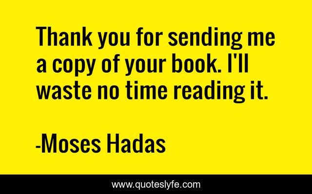 This page presents the quote "Thank you for sending me a copy of your book. I'll waste no time reading it.". Author of this quote is Moses Hadas. This quote is about classic-insult, bad-reviews, books, time, literary-criticism, irony,.