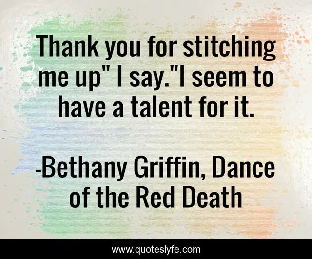 This page presents the quote "Thank you for stitching me up" I say."I seem to have a talent for it.". Author of this quote is Bethany Griffin, Dance of the Red Death. .
