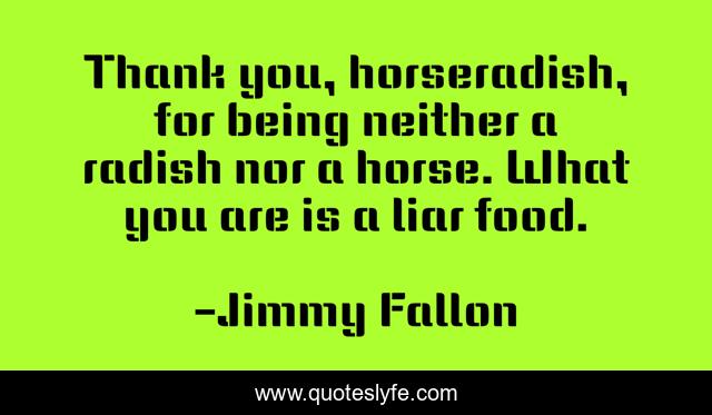 This page presents the quote "Thank you, horseradish, for being neither a radish nor a horse. What you are is a liar food.". Author of this quote is Jimmy Fallon. This quote is about thank you, horse, liar,.