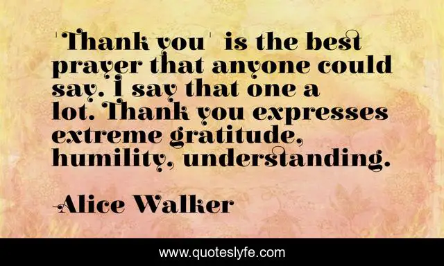 This page presents the quote "'Thank you' is the best prayer that anyone could say. I say that one a lot. Thank you expresses extreme gratitude, humility, understanding.". Author of this quote is Alice Walker. This quote is about gratitude, thankful,.