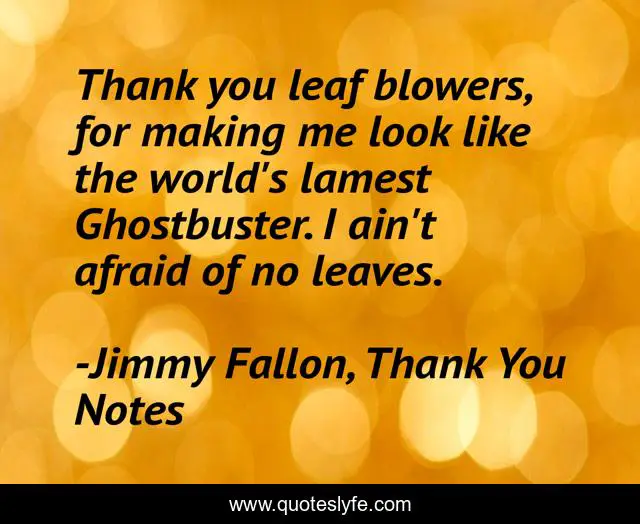 This page presents the quote "Thank you leaf blowers, for making me look like the world's lamest Ghostbuster. I ain't afraid of no leaves.". Author of this quote is Jimmy Fallon, Thank You Notes. This quote is about funny, humor, leaves, ghostbusters, fall, comedy,.