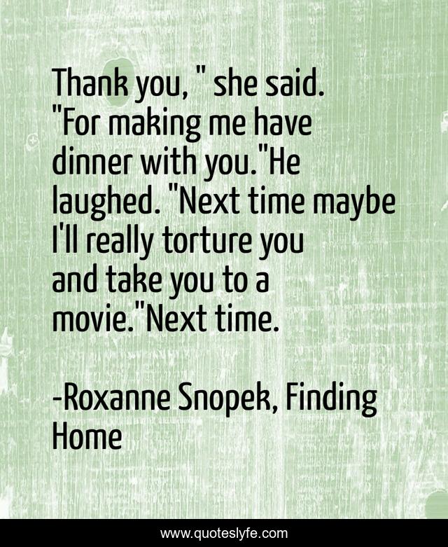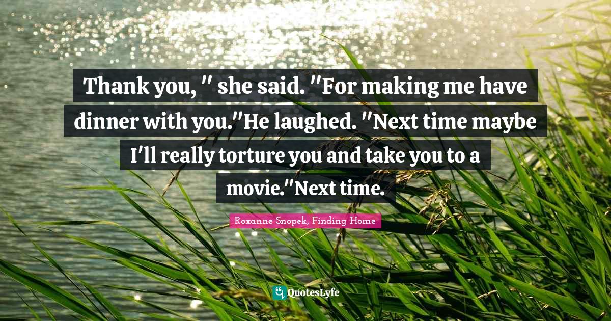 This page presents the quote "Thank you, " she said. "For making me have dinner with you."He laughed. "Next time maybe I'll really torture you and take you to a movie."Next time.". Author of this quote is Roxanne Snopek, Finding Home. .