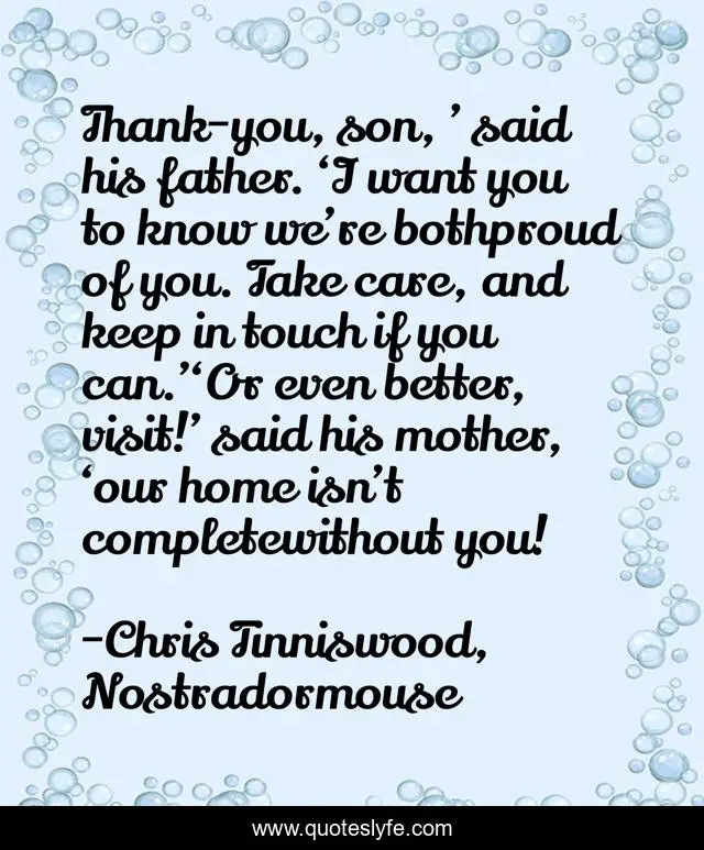 This page presents the quote "Thank-you, son, ’ said his father. ‘I want you to know we’re bothproud of you. Take care, and keep in touch if you can.’‘Or even better, visit!’ said his mother, ‘our home isn’t completewithout you!". Author of this quote is Chris Tinniswood, Nostradormouse. This quote is about fantasy, fable, fiction,.