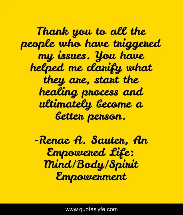 This page presents the quote "Thank you to all the people who have triggered my issues. You have helped me clarify what they are, start the healing process and ultimately become a better person.". Author of this quote is Renae A. Sauter, An Empowered Life: Mind/Body/Spirit Empowerment. This quote is about motivation, psychology, personal-growth, affirmation, healing, inspirational, self-help, enthusiasm,.