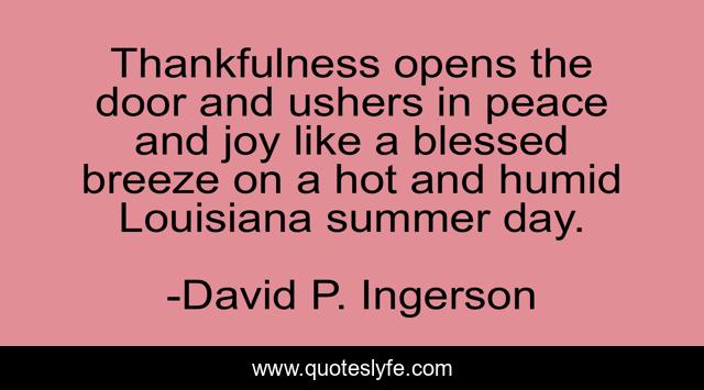 This page presents the quote "Thankfulness opens the door and ushers in peace and joy like a blessed breeze on a hot and humid Louisiana summer day.". Author of this quote is David P. Ingerson. This quote is about the-caleb-years, humid, opens-the-door, joy, lousiana-summer-day, peace, hot, thankfulness,.