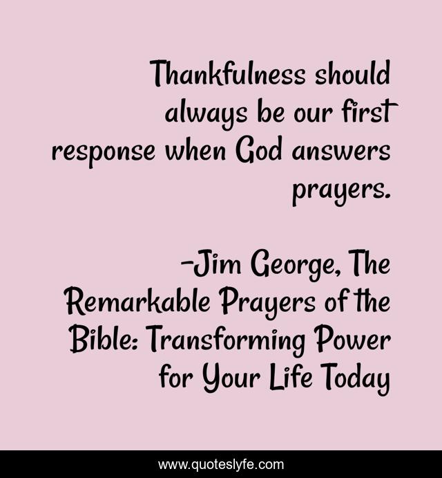 This page presents the quote "Thankfulness should always be our first response when God answers prayers.". Author of this quote is Jim George, The Remarkable Prayers of the Bible: Transforming Power for Your Life Today. This quote is about jim-george, god, answers, christianity, blessings, prayer, transformation,.
