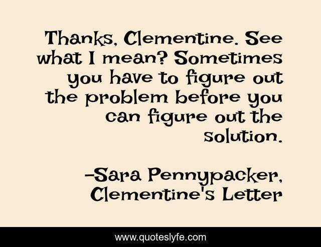 This page presents the quote "Thanks, Clementine. See what I mean? Sometimes you have to figure out the problem before you can figure out the solution.". Author of this quote is Sara Pennypacker, Clementine's Letter. This quote is about problem, solution,.