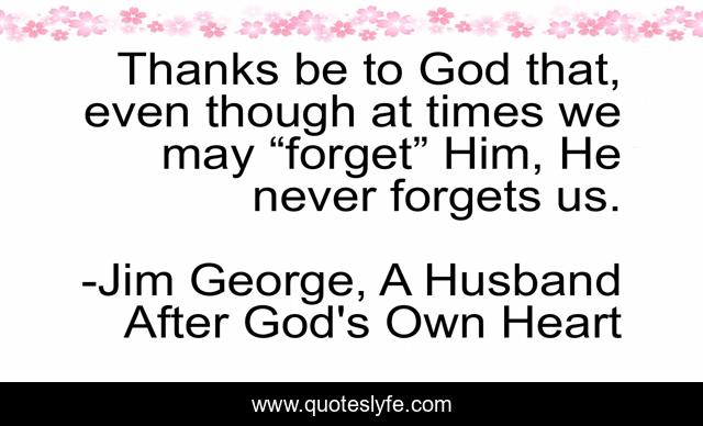 This page presents the quote "Thanks be to God that, even though at times we may “forget” Him, He never forgets us.". Author of this quote is Jim George, A Husband After God's Own Heart. This quote is about heart, christian, pray, god, men, inspirational, enthusiasm, husband,.