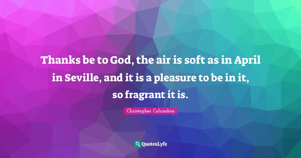 This page presents the quote "Thanks be to God, the air is soft as in April in Seville, and it is a pleasure to be in it, so fragrant it is.". Author of this quote is Christopher Columbus. This quote is about pleasure, thanks, seville, god, air, april,.