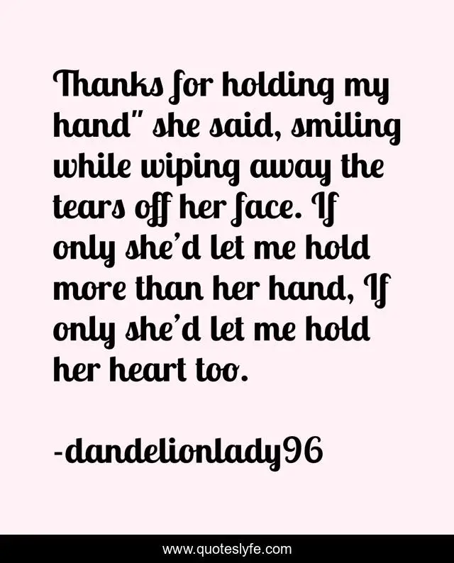 This page presents the quote "Thanks for holding my hand" she said, smiling while wiping away the tears off her face. If only she’d let me hold more than her hand, If only she’d let me hold her heart too.". Author of this quote is dandelionlady96. This quote is about friendship, love, unrequited-love, affection,.