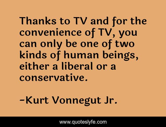 This page presents the quote "Thanks to TV and for the convenience of TV, you can only be one of two kinds of human beings, either a liberal or a conservative.". Author of this quote is Kurt Vonnegut Jr.. This quote is about turkey, politics, cold, dichotomy,.