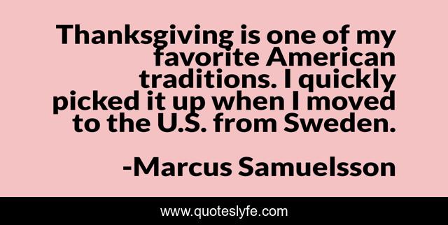 This page presents the quote "Thanksgiving is one of my favorite American traditions. I quickly picked it up when I moved to the U.S. from Sweden.". Author of this quote is Marcus Samuelsson. This quote is about american, favorite,.