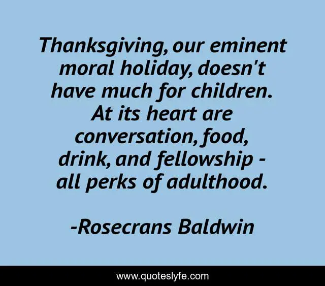 This page presents the quote "Thanksgiving, our eminent moral holiday, doesn't have much for children. At its heart are conversation, food, drink, and fellowship - all perks of adulthood.". Author of this quote is Rosecrans Baldwin. This quote is about food, heart, children,.
