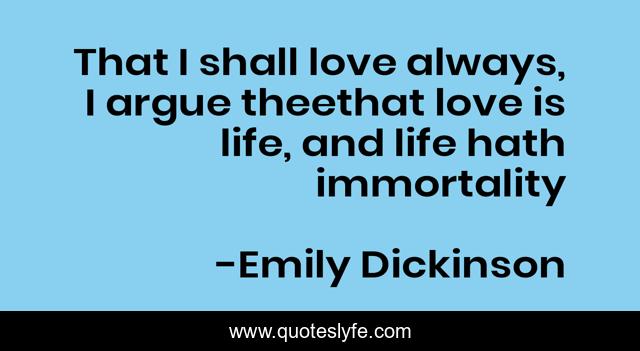 This page presents the quote "That I shall love always, I argue theethat love is life, and life hath immortality". Author of this quote is Emily Dickinson. This quote is about life, love, affection,.