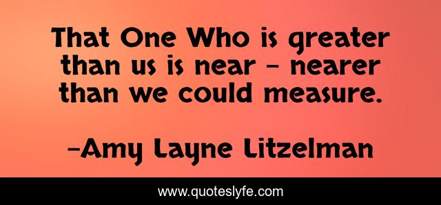 This page presents the quote "That One Who is greater than us is near - nearer than we could measure.". Author of this quote is Amy Layne Litzelman. This quote is about fellowship-with-christ, worship,.