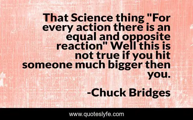 This page presents the quote "That Science thing "For every action there is an equal and opposite reaction" Well this is not true if you hit someone much bigger then you.". Author of this quote is Chuck Bridges. This quote is about action, reaction, science,.