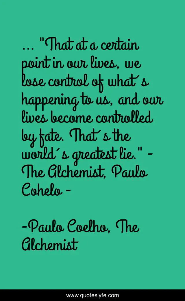 This page presents the quote "… "That at a certain point in our lives, we lose control of what´s happening to us, and our lives become controlled by fate. That´s the world´s greatest lie." - The Alchemist, Paulo Cohelo -". Author of this quote is Paulo Coelho, The Alchemist. This quote is about life, destiny, fate, the-alchemist, lives, life-lessons,.