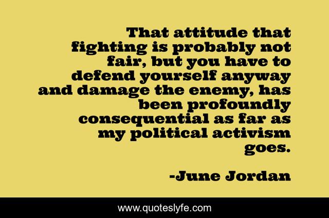 This page presents the quote "That attitude that fighting is probably not fair, but you have to defend yourself anyway and damage the enemy, has been profoundly consequential as far as my political activism goes.". Author of this quote is June Jordan. This quote is about political, yourself,.