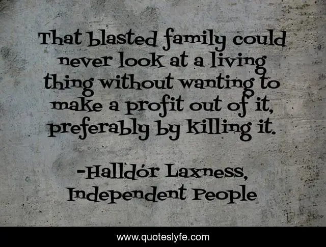 This page presents the quote "That blasted family could never look at a living thing without wanting to make a profit out of it, preferably by killing it.". Author of this quote is Halldór Laxness, Independent People. This quote is about exploitation, shooting, hunting, capitalism,.