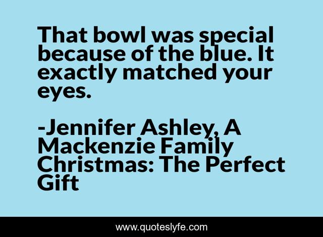 This page presents the quote "That bowl was special because of the blue. It exactly matched your eyes.". Author of this quote is Jennifer Ashley, A Mackenzie Family Christmas: The Perfect Gift. This quote is about eyes, ian, ming-bowl, beth,.