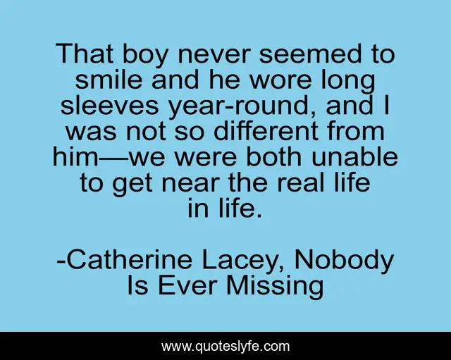 This page presents the quote "That boy never seemed to smile and he wore long sleeves year-round, and I was not so different from him—we were both unable to get near the real life in life.". Author of this quote is Catherine Lacey, Nobody Is Ever Missing. This quote is about comparison, nobody-is-ever-missing, catherine-lacey, sad, outsiders, apart,.