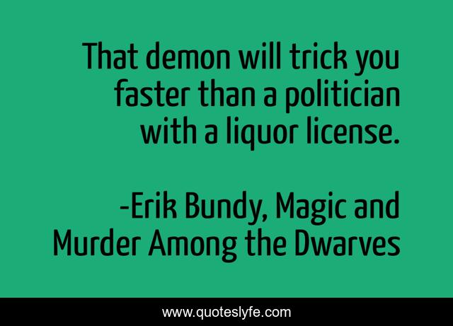 This page presents the quote "That demon will trick you faster than a politician with a liquor license.". Author of this quote is Erik Bundy, Magic and Murder Among the Dwarves. This quote is about demon, liquor, humor, politicians, trickery,.