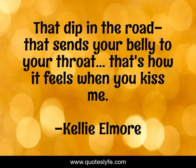 This page presents the quote "That dip in the road- that sends your belly to your throat... that's how it feels when you kiss me.". Author of this quote is Kellie Elmore. This quote is about relationships, cute, lovers, love, kisses, sweethearts, kissing, affection,.