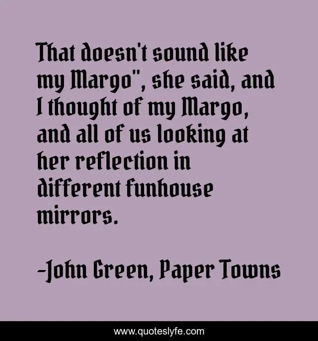 This page presents the quote "That doesn't sound like my Margo", she said, and I thought of my Margo, and all of us looking at her reflection in different funhouse mirrors.". Author of this quote is John Green, Paper Towns. This quote is about person, image,.