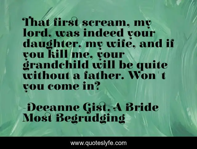 This page presents the quote "That first scream, my lord, was indeed your daughter, my wife, and if you kill me, your grandchild will be quite without a father. Won't you come in?". Author of this quote is Deeanne Gist, A Bride Most Begrudging. This quote is about a-bride-most-begrudging, christian, inspirational, historical-romance, brides, drew, constance, romance, bride,.