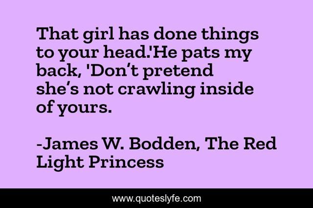 This page presents the quote "That girl has done things to your head.'He pats my back, 'Don’t pretend she’s not crawling inside of yours.". Author of this quote is James W. Bodden, The Red Light Princess. This quote is about head, celebrity, girls, worship, obsession, princess, women,.