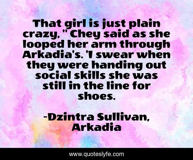 This page presents the quote "That girl is just plain crazy, " Chey said as she looped her arm through Arkadia's. 'I swear when they were handing out social skills she was still in the line for shoes.". Author of this quote is Dzintra Sullivan, Arkadia. This quote is about contemporary-romance, shifters, dragons, werewolves, ya, witches, young-adult, paranormal-romance,.
