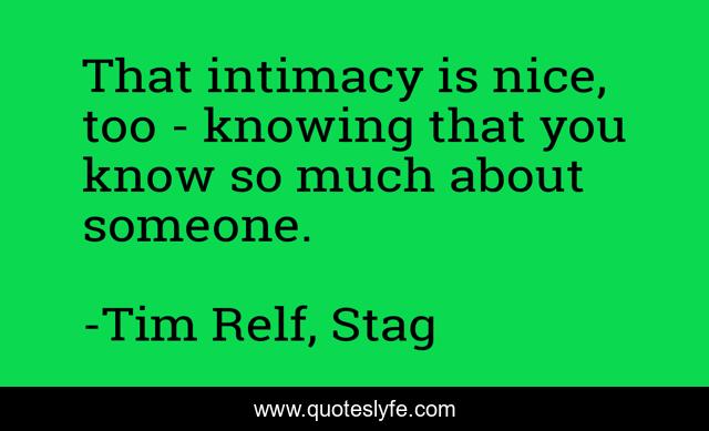 This page presents the quote "That intimacy is nice, too - knowing that you know so much about someone.". Author of this quote is Tim Relf, Stag. This quote is about knowing, intimacy, relationship,.