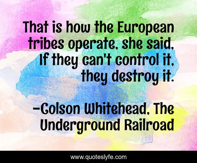 This page presents the quote "That is how the European tribes operate, she said, If they can't control it, they destroy it.". Author of this quote is Colson Whitehead, The Underground Railroad. .
