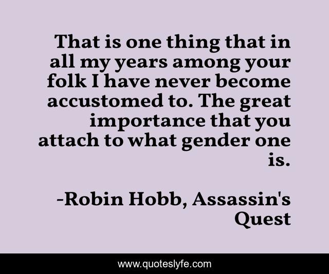 This page presents the quote "That is one thing that in all my years among your folk I have never become accustomed to. The great importance that you attach to what gender one is.". Author of this quote is Robin Hobb, Assassin's Quest. This quote is about gender, farseer-trilogy, robin-hobb, the-fool,.