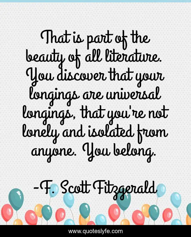 This page presents the quote "That is part of the beauty of all literature. You discover that your longings are universal longings, that you're not lonely and isolated from anyone. You belong.". Author of this quote is F. Scott Fitzgerald. This quote is about longings, belonging, literature, company, desires,.