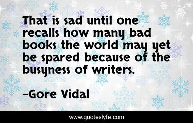 This page presents the quote "That is sad until one recalls how many bad books the world may yet be spared because of the busyness of writers.". Author of this quote is Gore Vidal. This quote is about may, world, bad,.