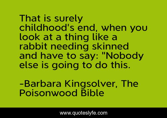 This page presents the quote "That is surely childhood's end, when you look at a thing like a rabbit needing skinned and have to say: "Nobody else is going to do this.". Author of this quote is Barbara Kingsolver, The Poisonwood Bible. This quote is about responsibility, childhood,.