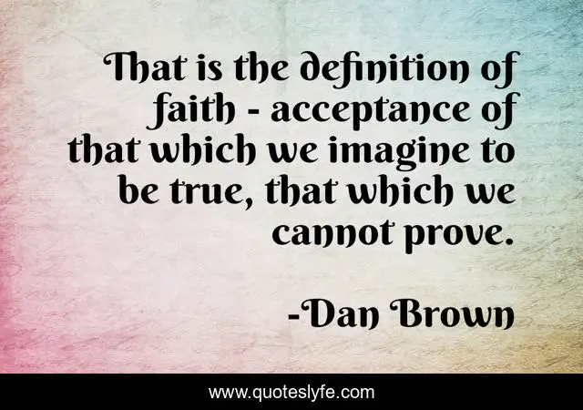 This page presents the quote "That is the definition of faith - acceptance of that which we imagine to be true, that which we cannot prove.". Author of this quote is Dan Brown. This quote is about be true, acceptance, true,.