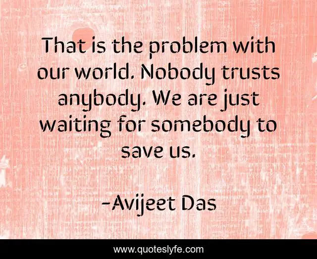 This page presents the quote "That is the problem with our world. Nobody trusts anybody. We are just waiting for somebody to save us.". Author of this quote is Avijeet Das. This quote is about world, life, trust, problems-in-the-world, worldview,.