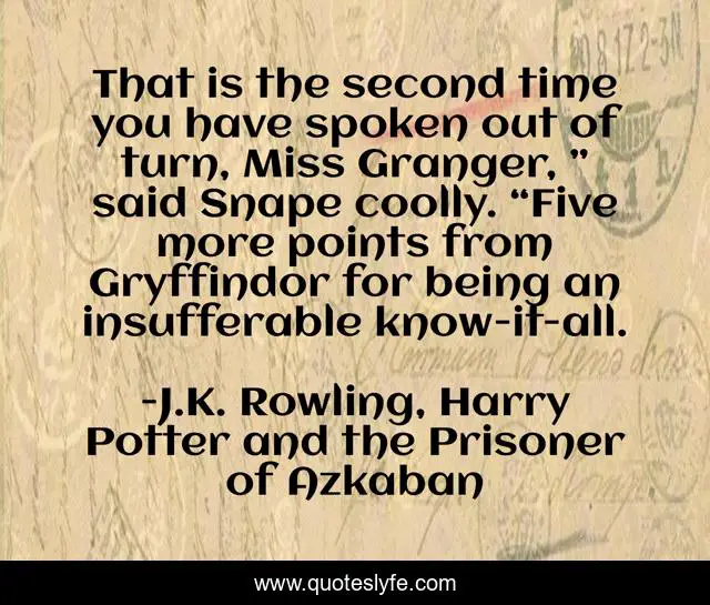 This page presents the quote "That is the second time you have spoken out of turn, Miss Granger, ” said Snape coolly. “Five more points from Gryffindor for being an insufferable know-it-all.". Author of this quote is J.K. Rowling, Harry Potter and the Prisoner of Azkaban. This quote is about humor, severus-snape,.