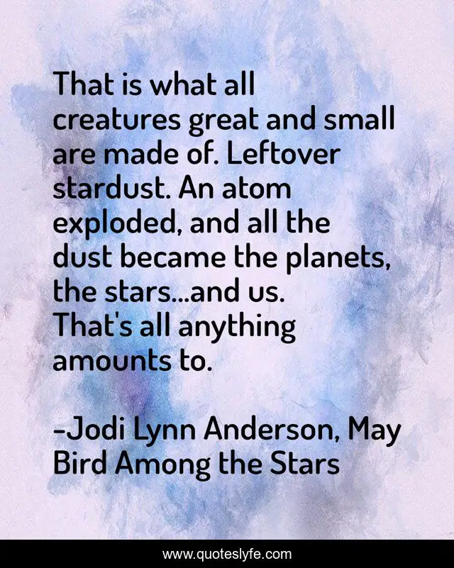 This page presents the quote "That is what all creatures great and small are made of. Leftover stardust. An atom exploded, and all the dust became the planets, the stars...and us. That's all anything amounts to.". Author of this quote is Jodi Lynn Anderson, May Bird Among the Stars. This quote is about stardust, stars,.