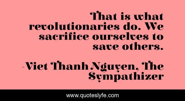 "Viet Thanh Nguyen, The Sympathizer Quotes." Quoteslyfe.com, 2025. Sat. 06 Dec. 2025. <https://www.quoteslyfe.com/quote/That-is-what-revolutionaries-do-We-sacrifice-198374>.