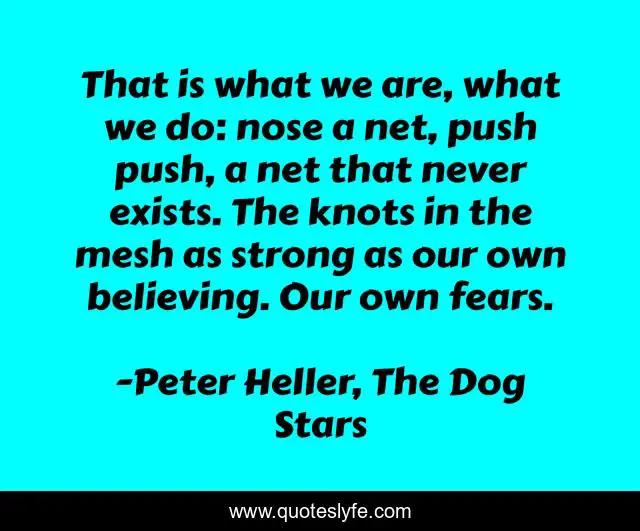 This page presents the quote "That is what we are, what we do: nose a net, push push, a net that never exists. The knots in the mesh as strong as our own believing. Our own fears.". Author of this quote is Peter Heller, The Dog Stars. This quote is about epistemology, fear, belief, self,.