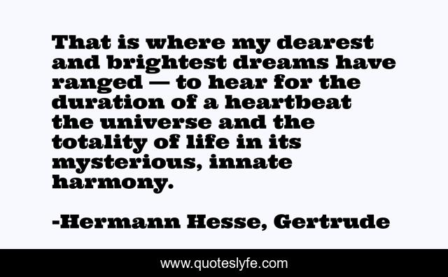 This page presents the quote "That is where my dearest and brightest dreams have ranged — to hear for the duration of a heartbeat the universe and the totality of life in its mysterious, innate harmony.". Author of this quote is Hermann Hesse, Gertrude. This quote is about universe, harmony,.