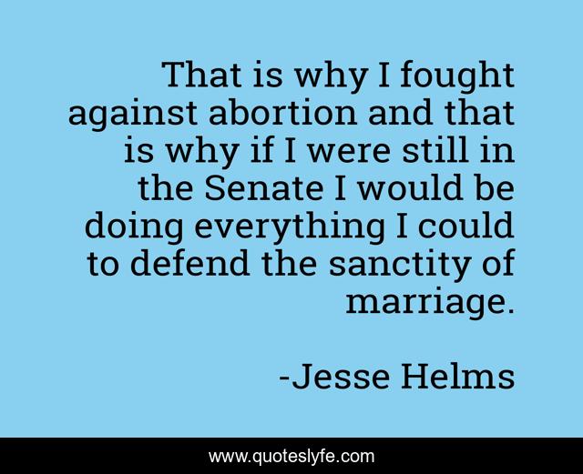 This page presents the quote "That is why I fought against abortion and that is why if I were still in the Senate I would be doing everything I could to defend the sanctity of marriage.". Author of this quote is Jesse Helms. This quote is about abortion, why,.