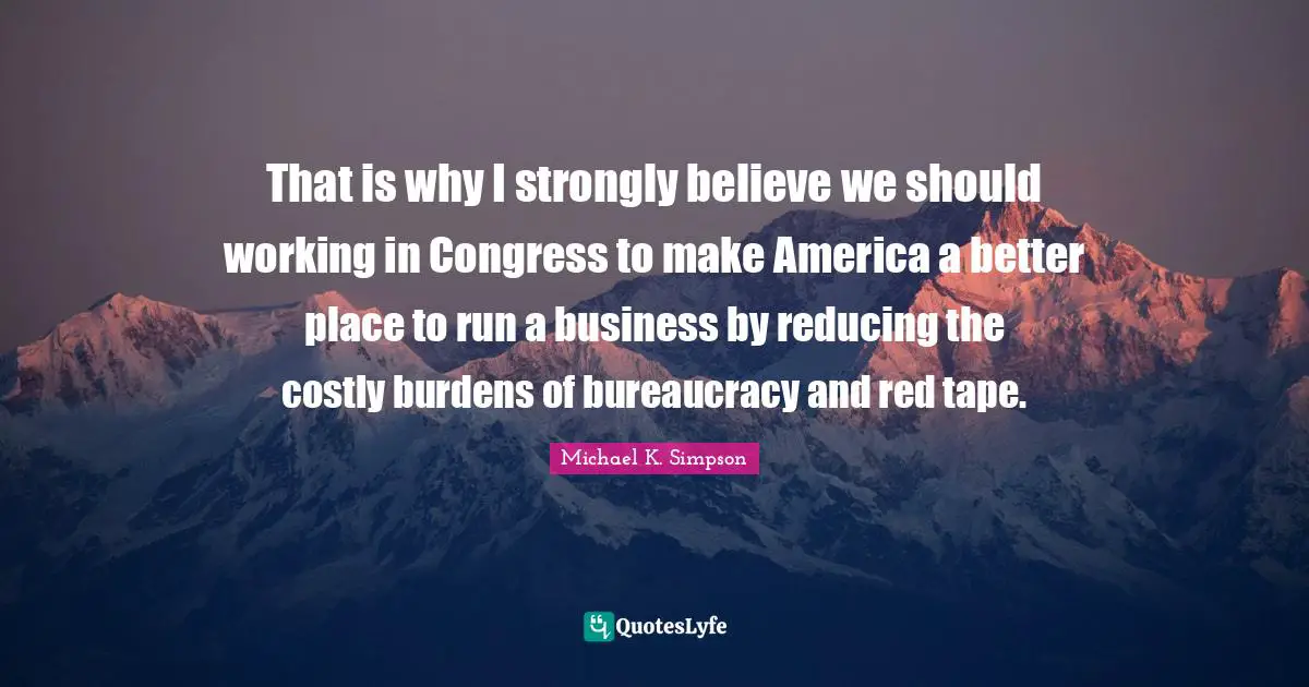 This page presents the quote "That is why I strongly believe we should working in Congress to make America a better place to run a business by reducing the costly burdens of bureaucracy and red tape.". Author of this quote is Michael K. Simpson. This quote is about red, believe, business, america, congress, bureaucracy, running, reducing, better place,.