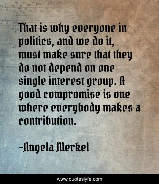 This page presents the quote "That is why everyone in politics, and we do it, must make sure that they do not depend on one single interest group. A good compromise is one where everybody makes a contribution.". Author of this quote is Angela Merkel. This quote is about good, compromise,.