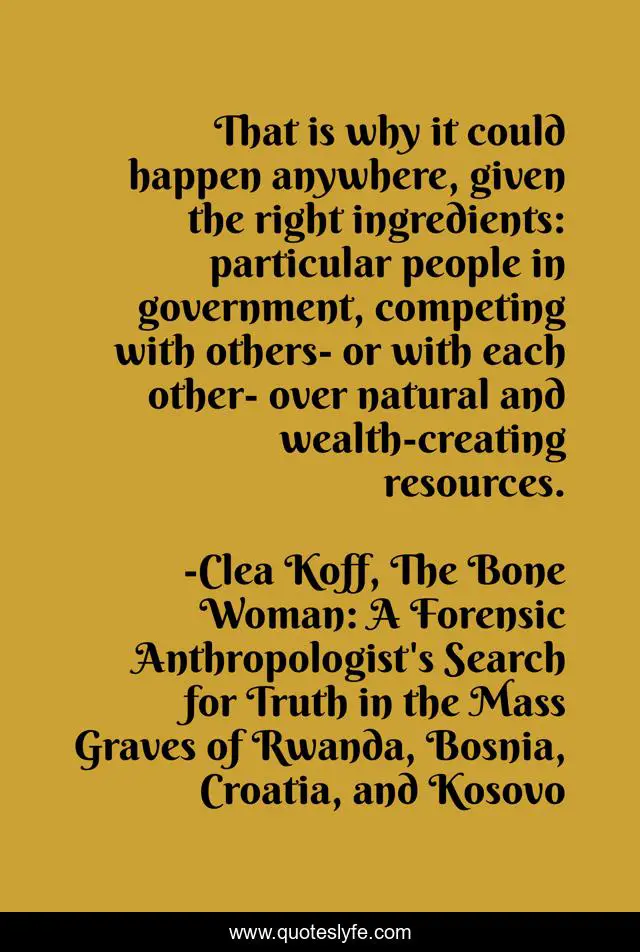This page presents the quote "That is why it could happen anywhere, given the right ingredients: particular people in government, competing with others- or with each other- over natural and wealth-creating resources.". Author of this quote is Clea Koff, The Bone Woman: A Forensic Anthropologist's Search for Truth in the Mass Graves of Rwanda, Bosnia, Croatia, and Kosovo. This quote is about woman, bone,.
