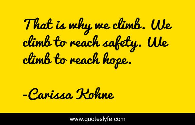 This page presents the quote "That is why we climb. We climb to reach safety. We climb to reach hope.". Author of this quote is Carissa Kohne. This quote is about life, safety, inspirational, enthusiasm, climb, hope,.